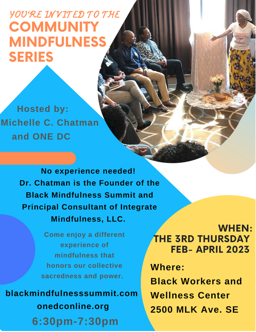 Dr. Michelle C. Chatman and ONE DC will be hosting The Black Mindfulness Summit, a Community mindfulness series centered around Black healing. The series will take place every 3rd Thursday of the month from February - April 2023, at the Black Workers & Wellness Center.