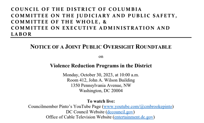 Councilmember Brooke Pinto, Council Chairman Phil Mendelson, and Councilmember Anita Bonds announce a joint public oversight roundtable of the Committee on the Judiciary and Public Safety, the Committee of the Whole, and the Committee on Executive Administration and Labor on the Mayor’s “Districtwide Review of Violence Reduction Programs.” The roundtable will be on Monday, October 30, 2023, at 10:00 a.m. in Room 412 of the John A. Wilson Building.