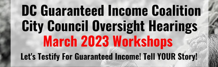 The Coalition’s next monthly meeting takes place next Thursday, March 16th, from 5-6pm. At this meeting, DC GIC will be providing assistance for writing and submitting testimony to the DC Council during Oversight Hearings in support of guaranteed income in DC.