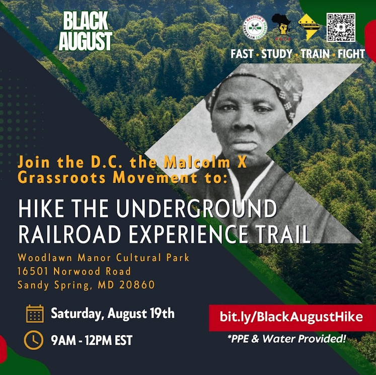 This Black August, join the D.C. Chapter of the Malcolm X Grassroots Movement in commemorating the principles of Black August by fasting, studying, training, and fighting. Together, we will practice the principle of training by hiking the The Underground Railroad Experience Trail in Sandy Spring on Saturday, August 19th from 9AM-12PM. Many of us will be fasting, so an earlier hike helps us keep hydrated and away from the afternoon sun. We can drink water and stay hydrated while fasting. MXGM will provide cold water and PPE for all those joining!