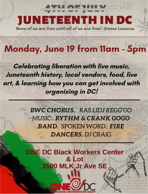 Back to All Events Juneteenth - Community Event 2023! Monday, June 19, 2023 11:00 AM 5:00 PM Black Workers & Wellness Center 2500 Martin Luther King Junior Avenue Southeast Washington, DC, 20020 United States (map) Google Calendar ICS Save the date! Join ONE DC for a Juneteenth Community Festival on Monday, June 19th. Experience live performances, vendors, food & drinks, and more! Let's commemorate & learn about Juneteenth while reflecting on its significance.