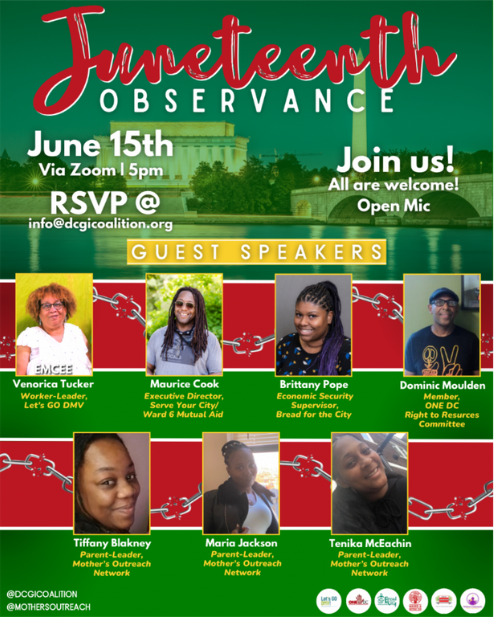 Join us on June 15th for DC Guaranteed Income Coalition's Juneteenth Observance! Hear from incredible guest speakers and join the open mic to celebrate economic freedom and Black resilience. See the above flier for details. For more info and Zoom link sign-up, email info@dcgicoalition.org.