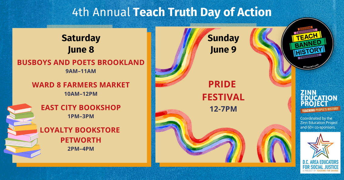 Visit D.C. Area Educators for Social Justice at our information tables to learn more about banned books and our Teach Truth campaign! If you would like to volunteer, please contact dcaesj@teachingforchange.org.