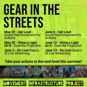 We don’t want lack of resources or access to equipment to be a barrier to taking action, so all of our gear is available to movement groups at incredibly reasonable sliding-scale rates, as long as you have someone in your group who can pick up the gear and knows how to use it! As summer approaches and more and more groups get in the streets we want to make sure as many people as possible are familiar with our equipment and can safely and effectively use it in actions.