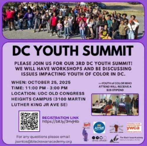 We will have workshops discussing issues impacting youth of color in DC. Please be sure to register in order for us to count accordingly for food and beverages.