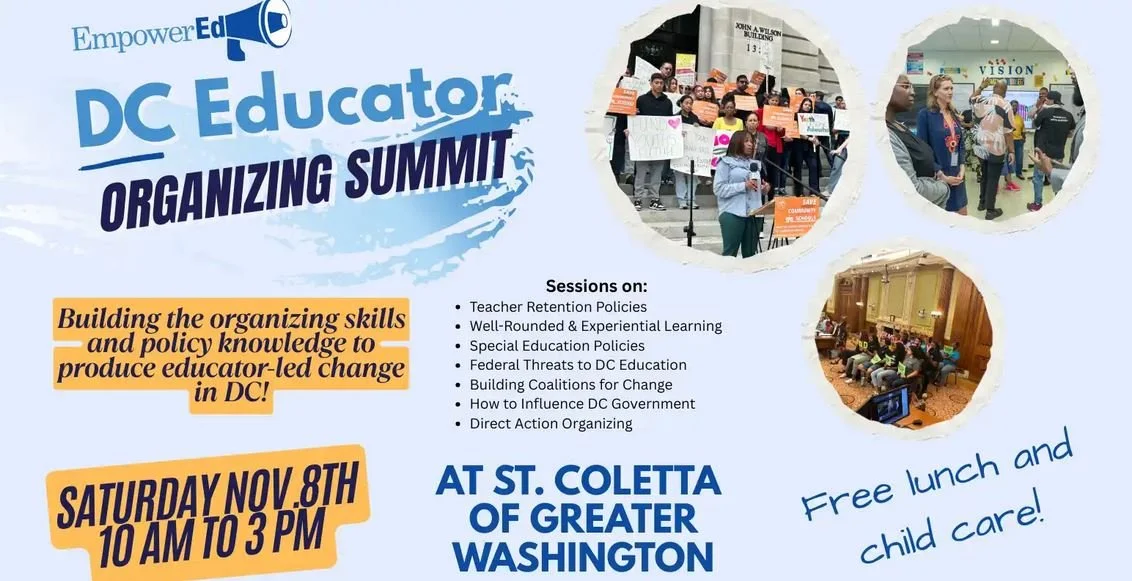 Join educators from across Washington, DC as we gather together to learn more about DC education policy and strengthen our organizing skills to help bring about more educator-led positive change in our city. We welcome all educators- including classroom teachers, aides, paraprofessionals, mental health professionals, counselors, deans and other support staff! Come learn from experts and experienced organizers. Lunch and child care is free!