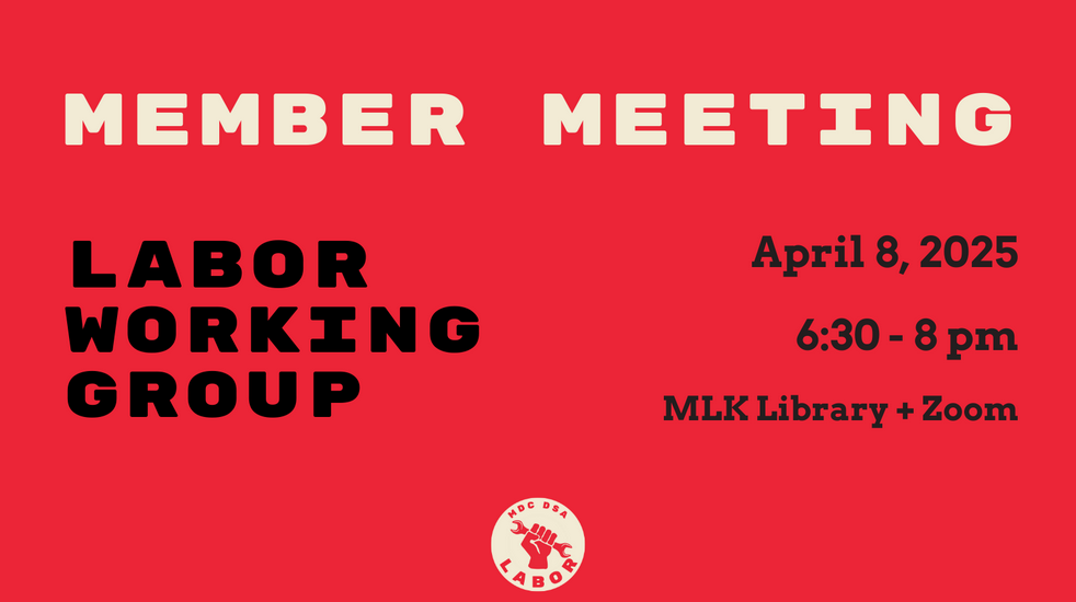 This hybrid event is open to both DSA Members and supporters. The in-person event will be at MLK Library. Those who wish to attend virtually will be provided a Zoom registration link after registering. If you require any accommodations to participate in this meeting, please email labor@mdcdsa.org.