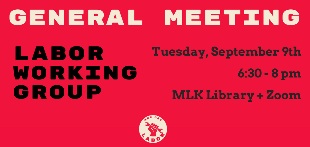 Join MDC DSA Labor for our September working group meeting. At this meeting, we will be discussing updates from ongoing labor campaigns, identifying action steps for solidarity, and sharing opportunities for further organizing.