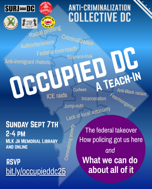 The presence and danger of federal and local police has been constant throughout DC and the DMV area long before this current crisis. While the urgency and danger of this moment can't and shouldn't be denied in many ways DC has always been an occupied city. Join us for a teach-in on the current federal takeover, how we can understand it in the context of policing and criminalization in DC, what we can do about all of it.