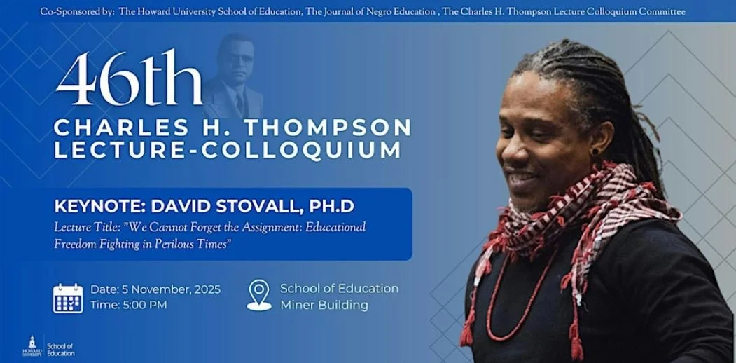 Thompson Lecture with keynote Dr. David Stovall Wednesday, November 5, 2025 5:00 PM 7:00 PM School of Education Myrtilla Miner Building 2565 Georgia Avenue Northwest Washington, DC, 20001 United States (map) Google Calendar ICS Join the Charles H. Thompson Colloquium for Dr. David Stovall’s keynote address “We Cannot Forget the Assignment; Educational Freedom Fighting in Perilous Times.”