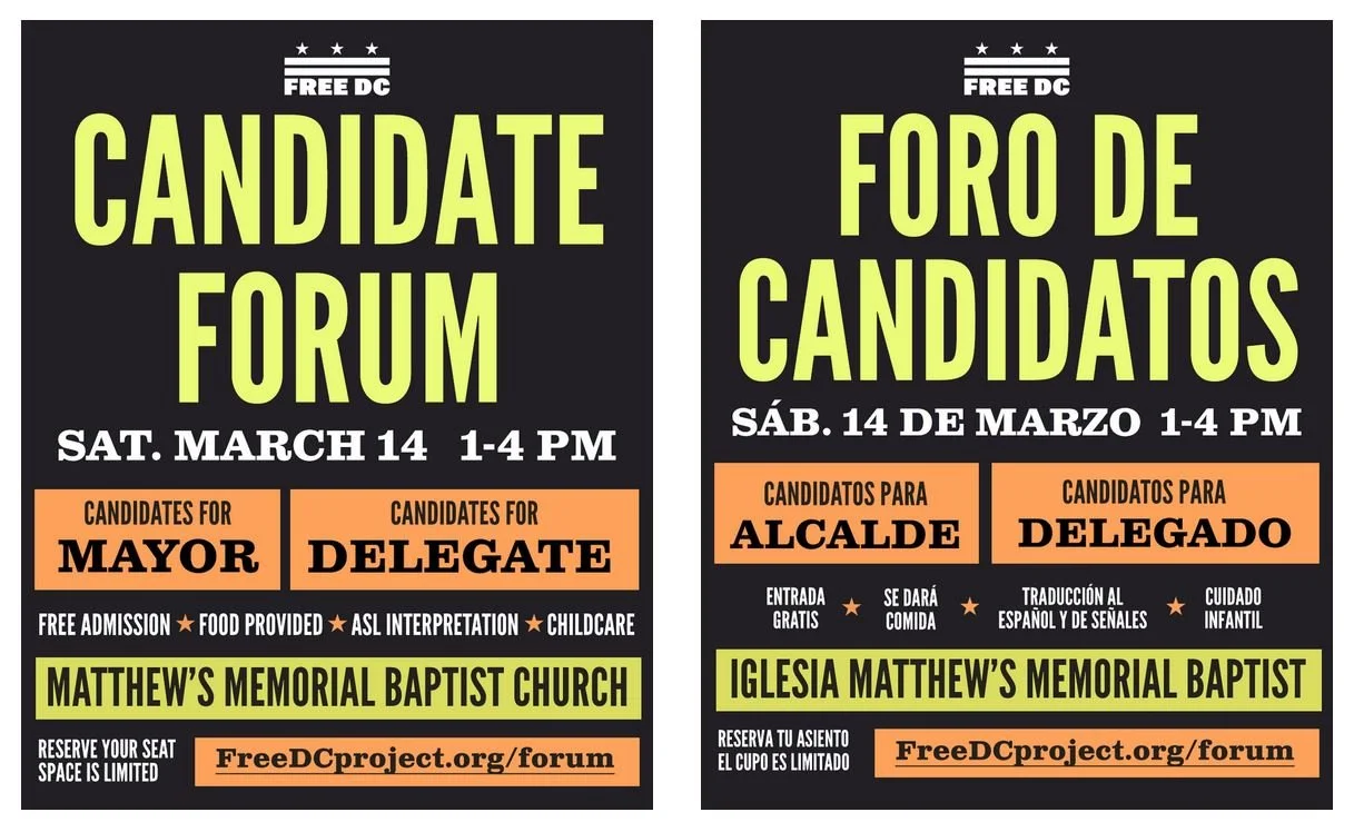 DC needs leaders who will side with our communities, not this regime. Several important elections are coming in DC this year and we want to make sure DC’s next leaders side with our communities, not this regime. Join Free DC for a candidate forum on Saturday, March 14. This event is free. Food will be served and childcare provided. ASL and Spanish interpretation. Register using the form below. / DC necesita líderes que estén del lado de nuestras comunidades, no del lado de este régimen. Se acercan varias elecciones importantes en DC este año, y queremos asegurarnos de que los próximos dirigentes de DC estén del lado de nuestras comunidades, no de este régimen. Súmate a Free DC para asistir a un foro de candidatos este sábado, 14 de marzo. Es un evento gratuito. Habrá comida y se proporcionará cuidado infantil. Hay traducción al español y a lenguaje de señales. Regístrate usando este formulario.